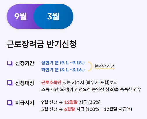 - 반기 신청은 근로소득만 있는 가구를 대상으로 하며, 상반기 신청은 9월 1일부터 15일까지 신청해 12월 30일에 일부(35%)를 먼저 지급받을 수 있고, 나머지는 다음 해 6월에 정산됩니다.